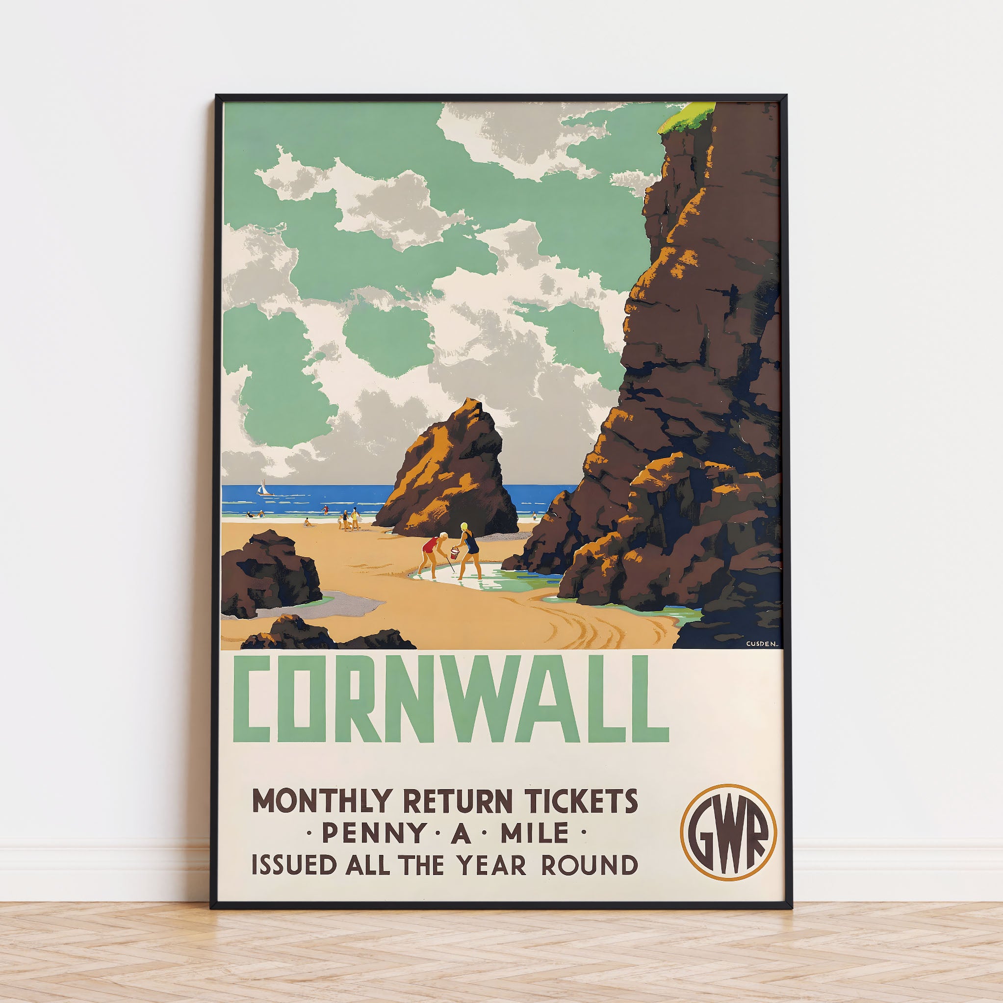 Leonard Cusden (1898-1979) was a versatile British commercial artist whose career spanned from the early 1930s through to the early 1970s. He produced numerous railway posters for the Great Western Railway, Southern Railways, and later British Railways, with his distinctive style becoming a hallmark of British travel advertising. Cusden's work for the GWR featured prominently in their tourism campaigns for Devon and Cornwall, capturing the essence of these popular holiday destinations with bold colours and elegant compositions. Beyond railway posters, Cusden became particularly well-known for his work with the Royal Society for the Prevention of Accidents (RoSPA), creating hundreds of workplace safety posters that combined striking imagery with powerful messaging. During World War II, he also designed propaganda posters, further demonstrating his versatility as a commercial artist. His distinctive artistic approach embraced the clean lines and geometric forms of Art Deco, while maintaining accessible imagery that appealed to a broad public audience. Cusden later taught at the London College of Printing in the mid-1960s, where he was remembered as "a quietly spoken, intelligent man" who mentored younger artists and designers.