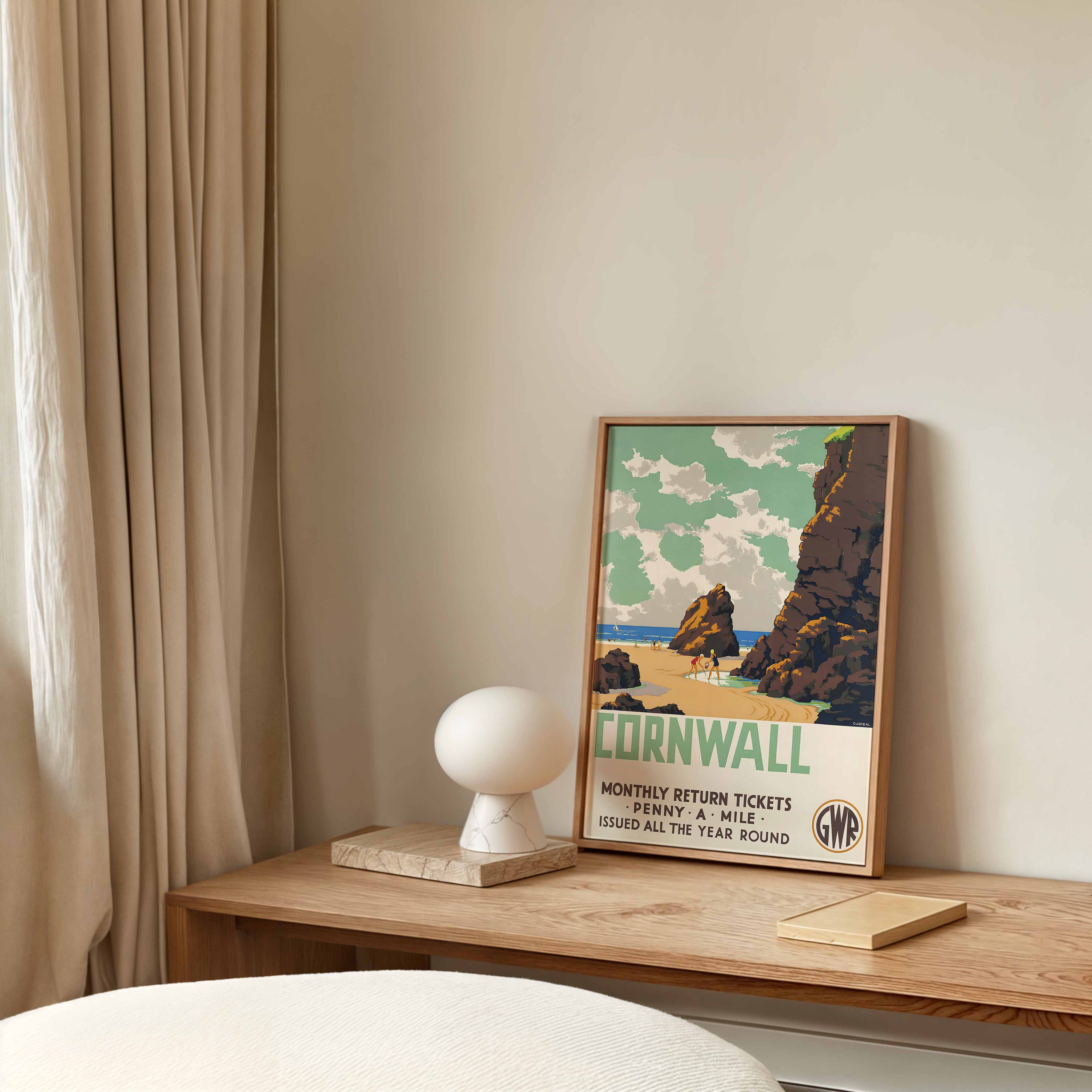 This poster was commissioned by the Great Western Railway (GWR) in 1935 to promote tourism to Cornwall's coastal resorts as part of their extensive holiday marketing campaigns. Though depicted as a generic Cornish beach scene, the location is believed to represent Newquay, one of Britain's most popular seaside destinations of the era. The GWR, often nicknamed "The Holiday Line", played a crucial role in developing tourism in the West Country and Cornwall during the interwar period. The "penny a mile" monthly return tickets advertised in the poster were an important marketing initiative to make train travel more affordable for middle-class holidaymakers during the economic challenges of the 1930s Depression. The GWR's publicity department was renowned for its innovative approach to advertising, using high-quality artwork from leading commercial artists to create memorable images that became synonymous with British seaside holidays. This poster exemplifies the railway company's strategy of promoting Cornwall as an accessible domestic holiday destination with dramatic landscapes and family-friendly beaches.