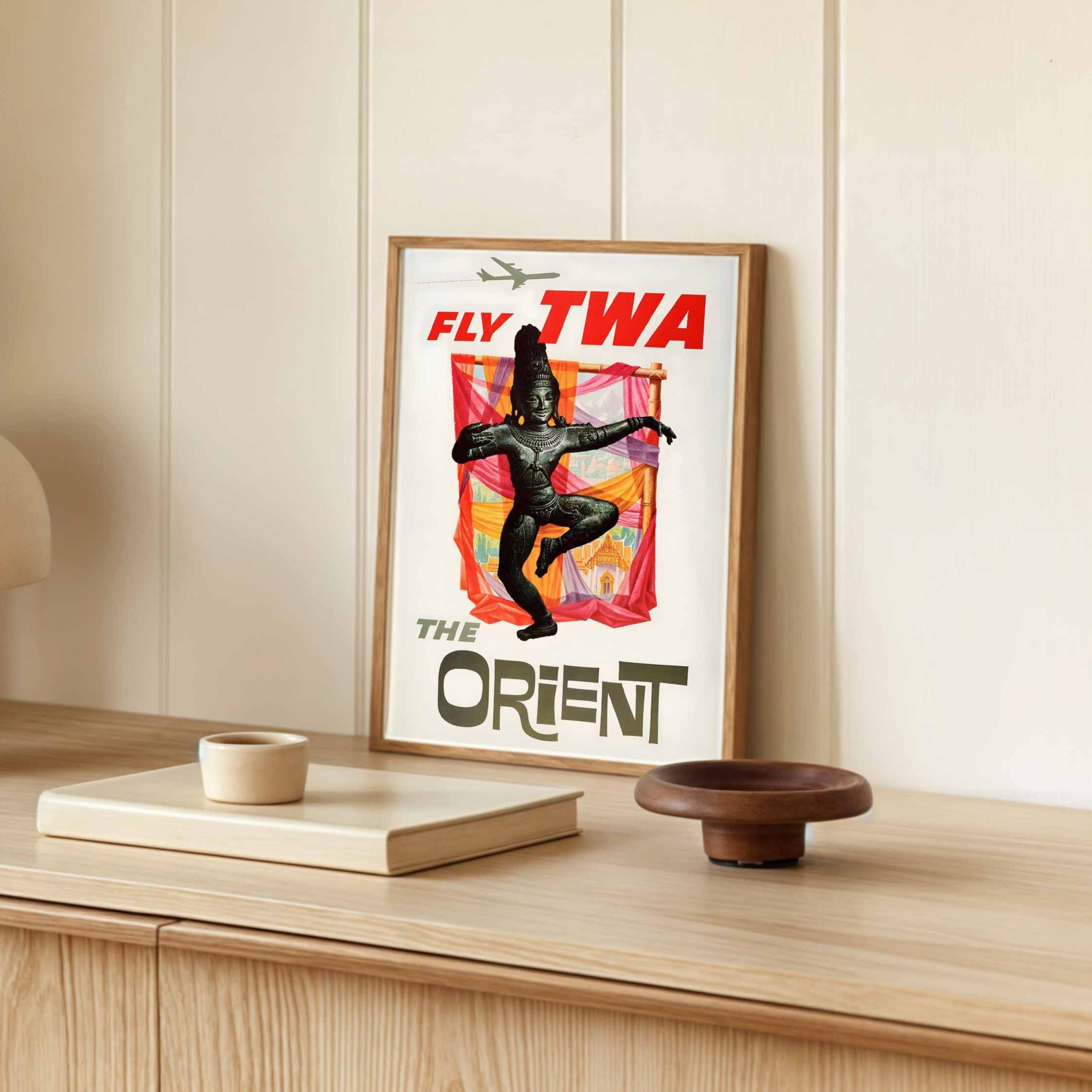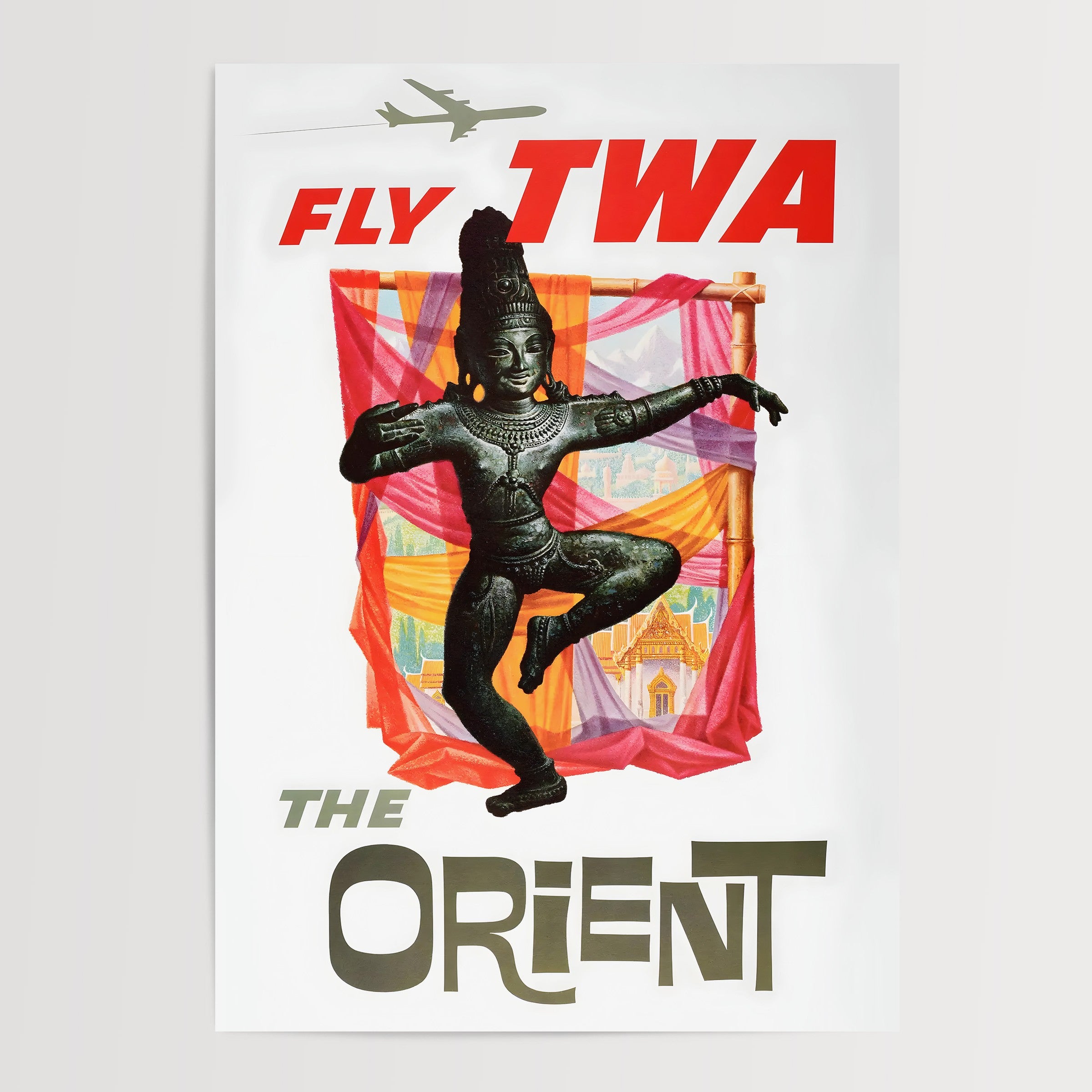 This poster was created during a significant period of expansion for Trans World Airlines, which had been transformed from a domestic carrier into a global airline under the ownership of Howard Hughes. After World War II, TWA expanded its routes to serve Europe, the Middle East, and Asia, establishing itself as a second unofficial flag carrier of the United States alongside Pan American World Airways. By 1958, when this poster was created, TWA had firmly established itself as a luxury international carrier, offering routes that stretched from Europe to Asia, including service to destinations as far east as Hong Kong. This advertisement represents TWA's efforts to promote its Asian routes during the "golden age" of air travel, when flying was still considered glamorous and exotic. The term "The Orient," while outdated by modern standards, was commonly used in the 1950s to refer collectively to East and Southeast Asian countries, embodying the Western fascination with these destinations as places of mystery, spirituality, and cultural richness.