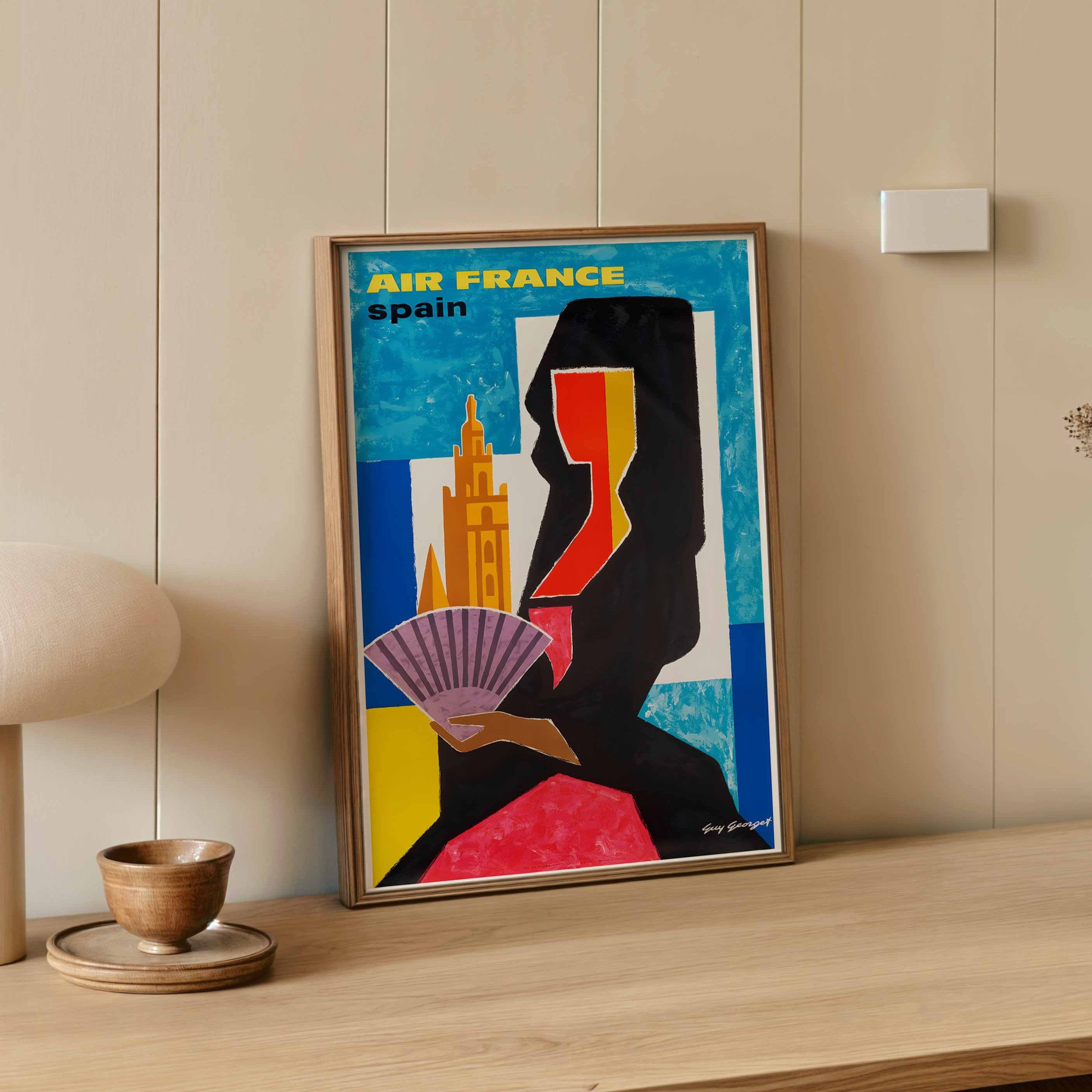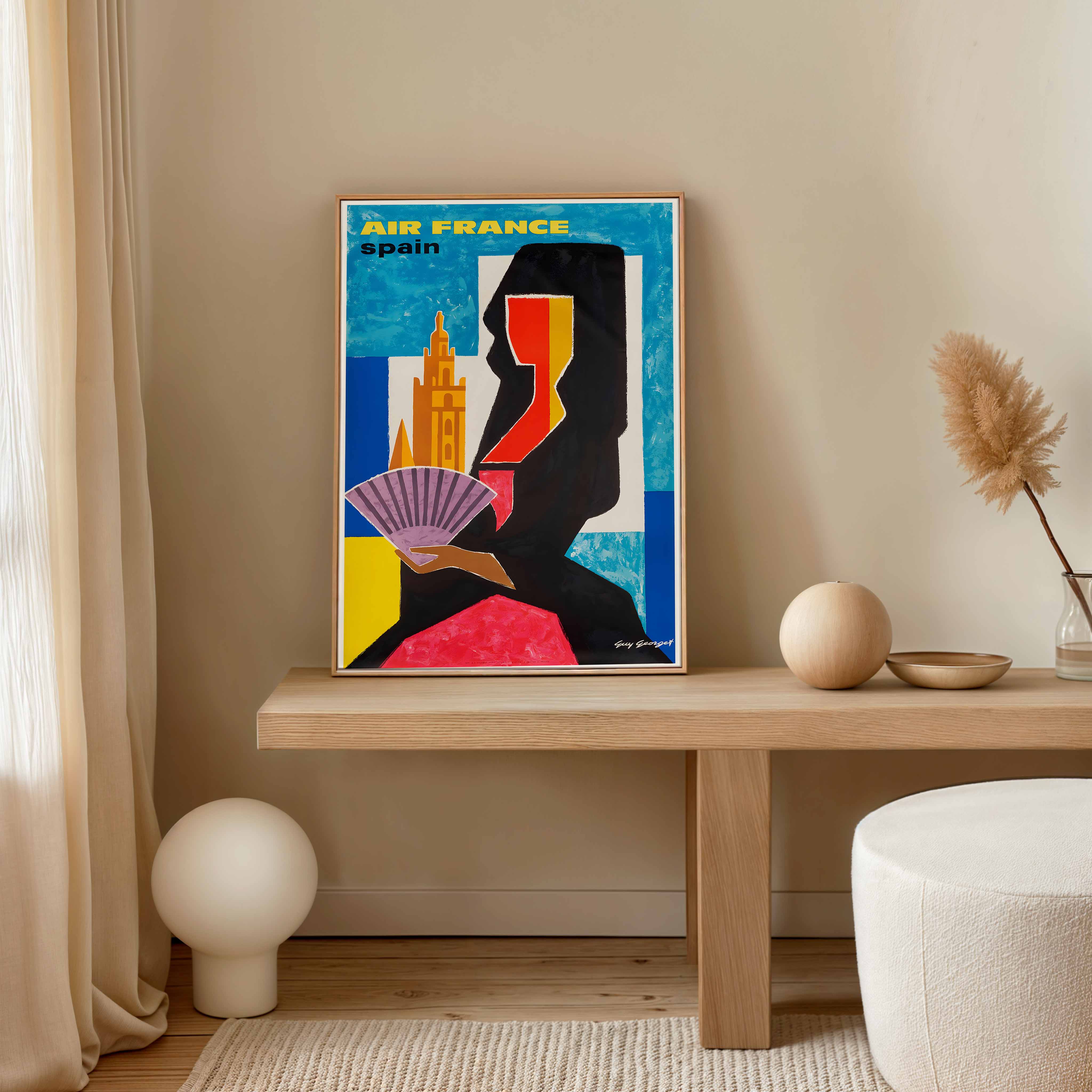 Guy Georget (1911-1992) was a highly regarded French commercial artist whose career spanned from the late 1940s through the 1960s. Initially hired by tourist boards to create posters promoting Spain, his early works showed clear influences of Picasso and Georges Braque. Georget's artistic style evolved significantly throughout his career, moving from more traditional approaches to increasingly graphic, bold compositions with vibrant colours and simplified forms that epitomised mid-century modern design aesthetics. His association with Air France represented a prestigious commission, as the airline was among France's most important commercial enterprises of the era. In 1960, Georget achieved significant recognition when he designed the official logo for France's postal service "La Poste," cementing his reputation as one of the country's leading graphic designers.