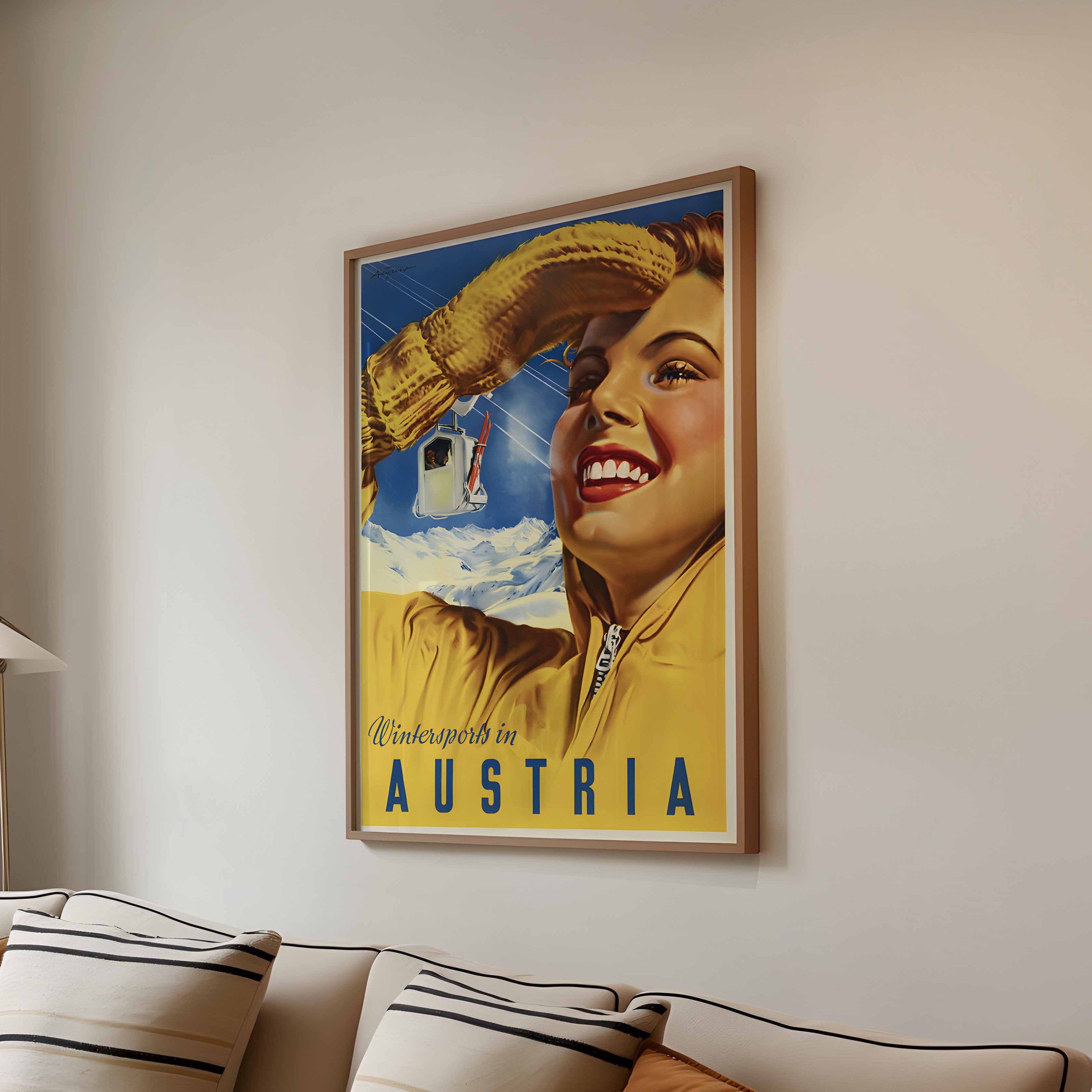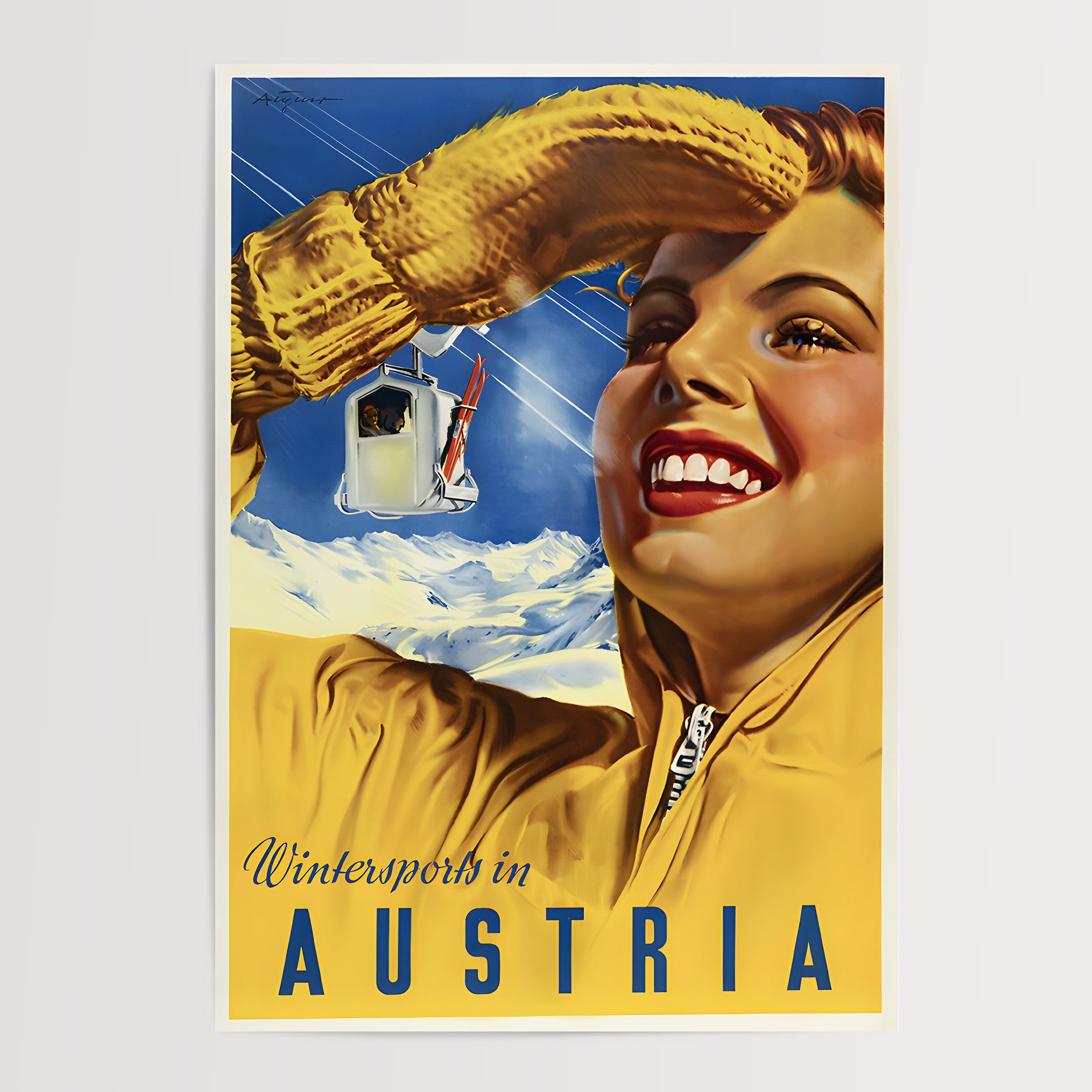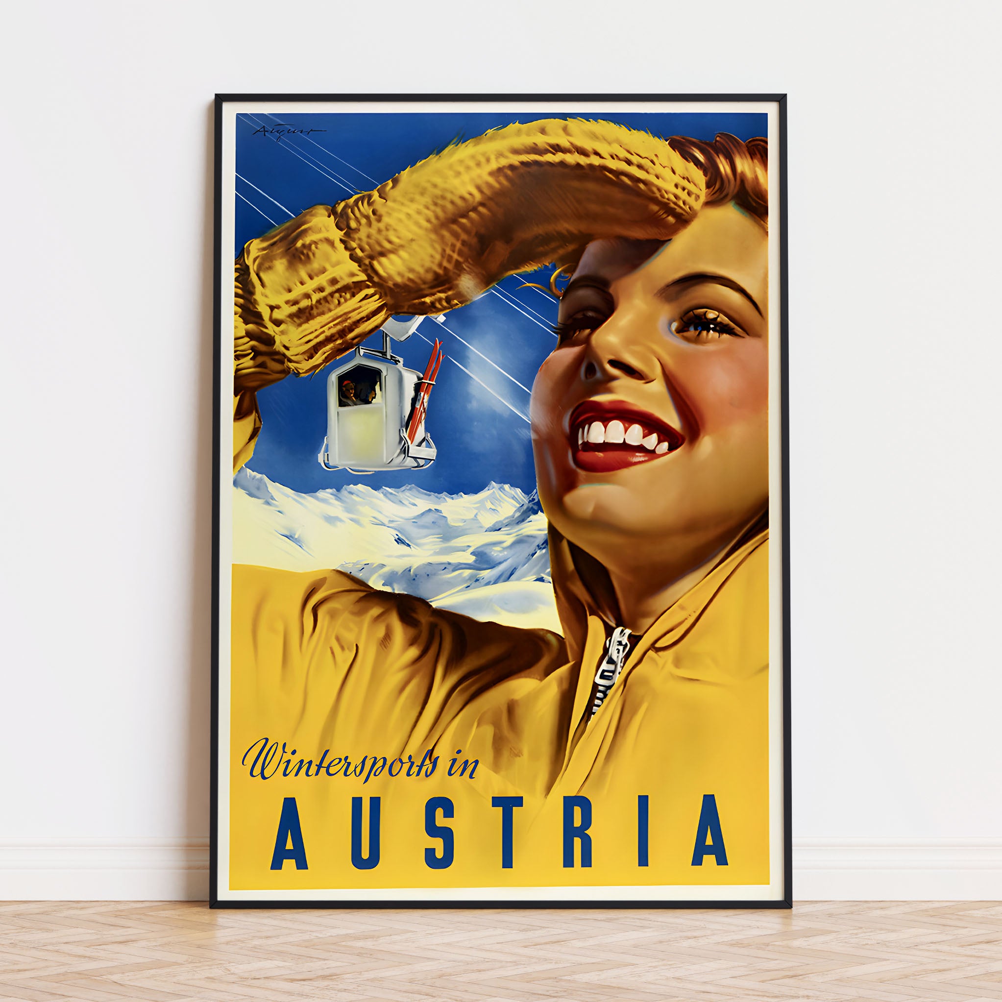 This captivating vintage poster showcases a joyful young woman in a vibrant yellow ski jacket and wool gloves, her hand shielding her eyes from the bright sun as she gazes across a breathtaking Alpine landscape. Behind her, a cable car transports skiers across the snowy mountains, while the deep blue sky provides a striking contrast to the pristine white snow. The bold blue typography at the bottom declares "AUSTRIA" in capital letters, with "Wintersports in" elegantly scripted above it.